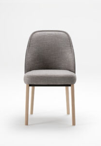 The June chair features a flowing silhouette with high resilience foam padding covered in fabric available in a range of quality textiles. Founded on solid wood or metal legs, this piece combines comfort and elegance, promising to become a refined focal point in any dining or work space.