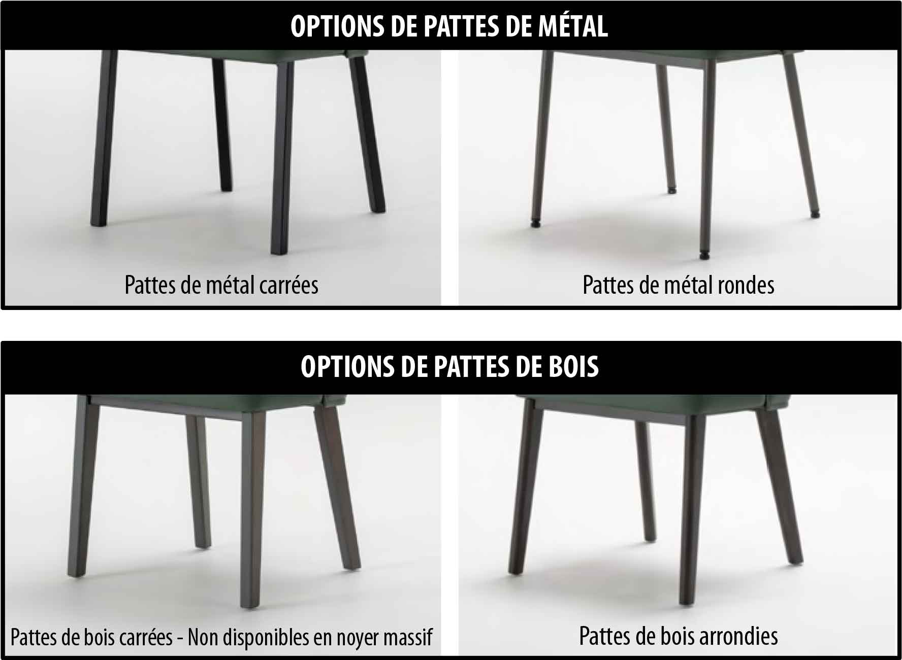 Disponible avec pattes de métal, de merisier, de chêne ou de noyer massif.