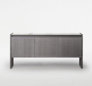 Buffet combinant une structure en placage de bois, offrant une texture naturelle et chaleureuse, avec un dessus en verre ou porcelaine, ce qui ajoute une touche de finesse et d'élégance à sa fonctionnalité.