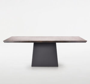 Cette table arbore une base métallique avec une forme sculpturale qui lui confère une allure moderne. Elle est personnalisable avec un choix de dessus en bois massif, en verre ou en porcelaine, et est proposée en diverses tailles pour s'adapter à différents espaces et besoins.